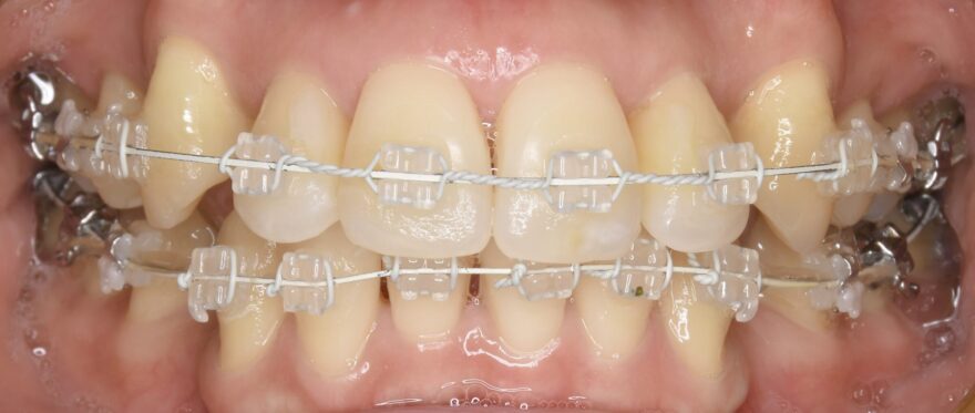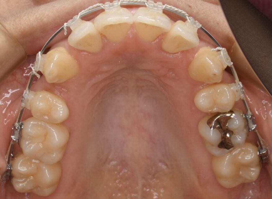 上下ともには表側に矯正装置が付いています。