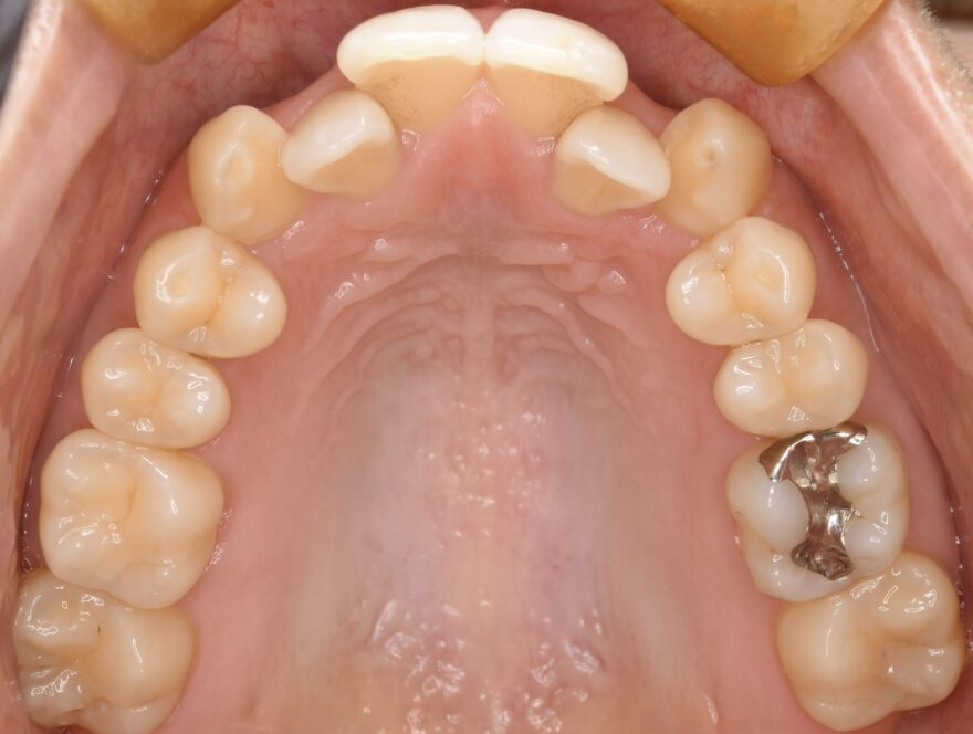 左上の2番目の前歯が、内側に引っ込んでいます。