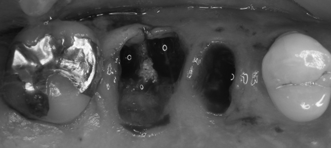 抜歯した直後に、インプラントを埋入した後の口腔内写真。