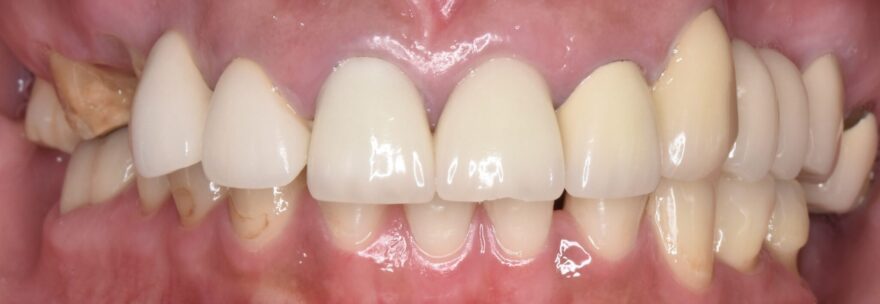 8本のインプラント治療と16本のセラミック治療で、しっかり上下の歯が噛み合う状態にしました。