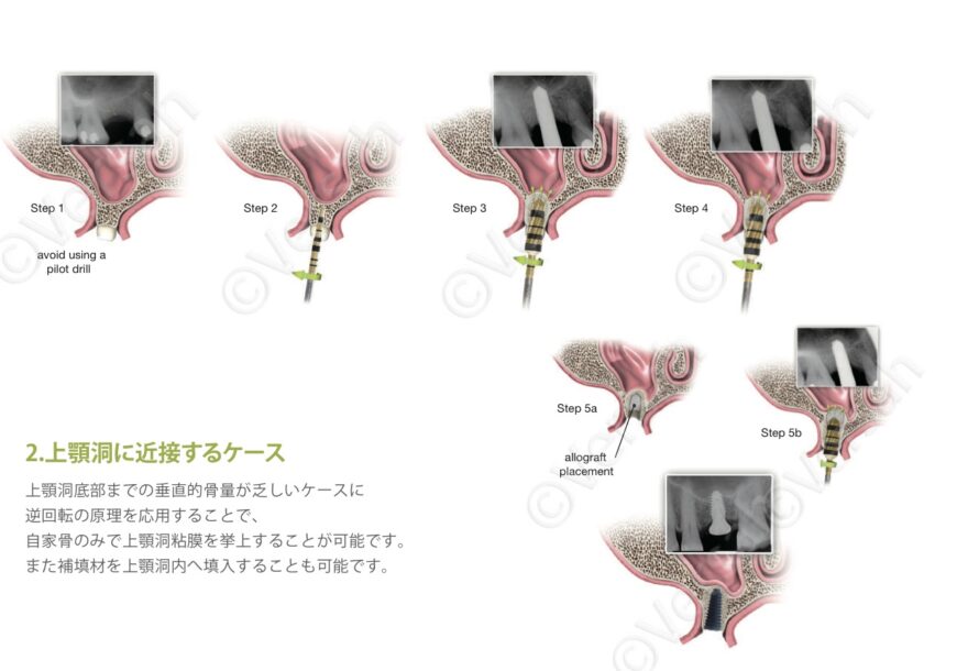 特殊なドリル(Densah® Bur)を高速逆回転で使用し、ご自身の骨を先端方向に運ぶことで、安全に上顎洞底粘膜を挙上することができます。