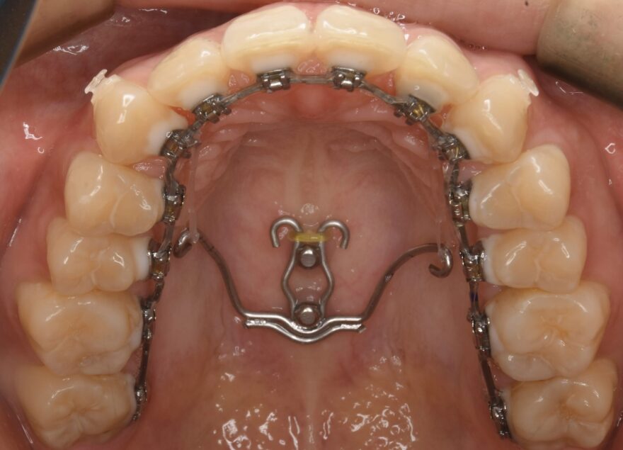 口蓋に2本の歯科矯正用アンカースクリューが埋め込まれ、裏側の矯正装置とゴムで繋がっていることがわかります。